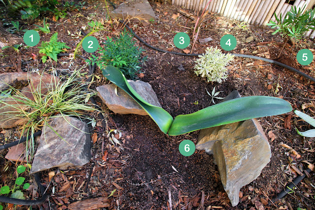 ⑤ Leatherleaf fern (Ruhmora adiantiformis) — from Annie’s Annuals; planted spring 2017