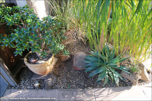 The next question, logically, was where to put my dudleyas. Since they would fry to a crisp in the summer if planted in full sun, I needed a more sheltered place. I eventually decided on the spot marked with a yellow arrow in the photo below: