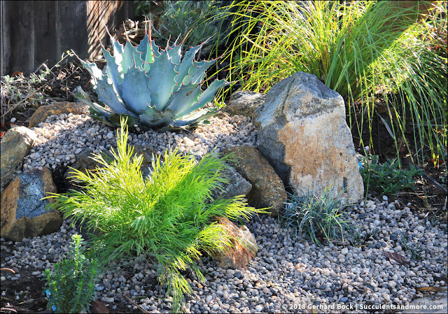 | Agave parrasana ‘Globe’ (all the way on the left), Aloe excelsa, Grevillea plurijuga ssp. superba (behind Aloe excelsa), Yucca ‘Bright Star’, Aloe marlothii |