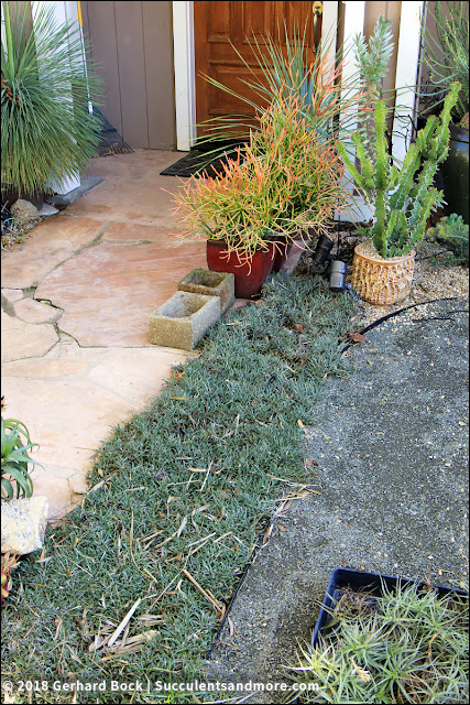 The second project is in the front yard. See the Dymondia margaretae? I removed it yesterday and replanted it in the backyard. This strip will look very different the next time I show you a photo.
