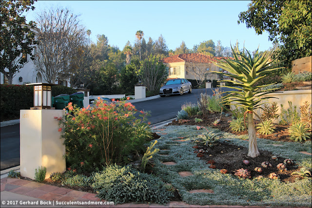 Piece of Eden, one might say. Many of you will recognize the name: Piece of Eden is Hoover Boo’s popular blog about her garden in Orange County. If you’ve followed Piece of Eden over the years, you know how much work has gone into transforming what could have been a typical (i.e. boring) suburban garden into a showcase for water-wise plants. Yes, there are many succulents, but Hoover Boo also gravitates towards plants from other Mediterranean climate zones around the world, including shrubs from South Africa and Australia. Her plant palette is so much in line with my own taste that I’d like to think, somewhat grandiosely maybe, that my garden would look much like hers if I lived in the same climate (zone 10a, no frost to speak of).