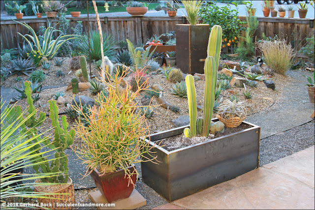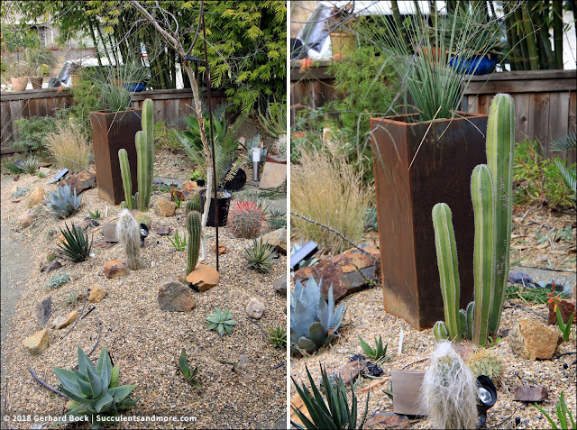 In addition to the Mexican fencepost cactus, I also moved an Echinopsis hybrid (you see it in its in new spot on the left in the photo below). This made room for the new centerpiece of this bed: Dioon argenteum, a cycad from Mexico. Right now its leaves are green, but as it gets older, it will produce leaves with a silver sheen.