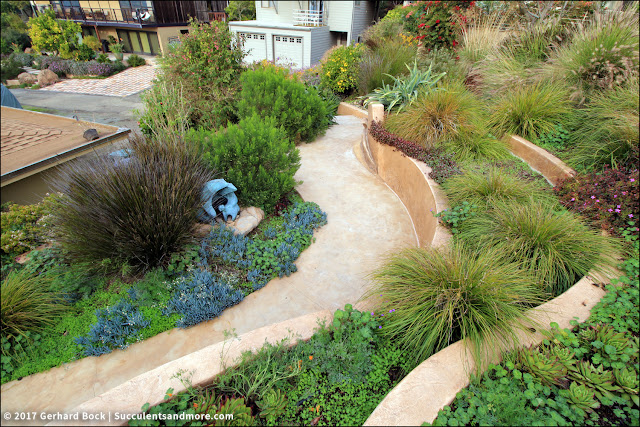 The creative minds behind the Wave Garden are Victor Amador who did the concrete work (800 lineal feet of textured walls and paths), Robert Sharpe who designed the metal gates and fences, and Kellee Adams of dig-it landscape design who came up with the plant palette. Click here and scroll to the bottom to see the Wave Garden under construction (in 2006, I believe).